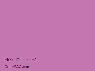 Hex #c476b1 Color is a light magenta color and the nearest color is Sky Magenta #cf71af. Hex code #c476b1 and RGB value is rgb(196,118,177). In RGB color space, this color is composed of 77% red, 46% green, 69% blue, In CMYK color space, this color is composed of 0% cyan, 40% magenta, 10% yellow , 23% black , In HSL color space, this color has a hue angle of 315° , 40% saturation and 62% lightness.
