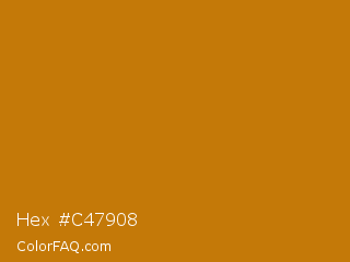 Hex #c47908 Color is a normal orange color and the nearest color is Pirate Gold #ba7f03. Hex code #c47908 and RGB value is rgb(196,121,8). In RGB color space, this color is composed of 77% red, 47% green, 3% blue, In CMYK color space, this color is composed of 0% cyan, 38% magenta, 96% yellow , 23% black , In HSL color space, this color has a hue angle of 36° , 92% saturation and 40% lightness.
