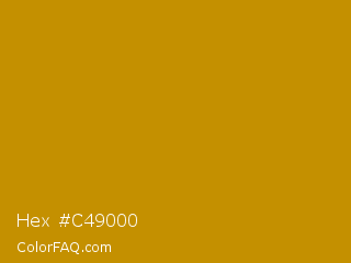 Hex #c49000 Color is a normal orange color and the nearest color is Vivid Amber #cc9900. Hex code #c49000 and RGB value is rgb(196,144,0). In RGB color space, this color is composed of 77% red, 56% green, 0% blue, In CMYK color space, this color is composed of 0% cyan, 27% magenta, 100% yellow , 23% black , In HSL color space, this color has a hue angle of 44° , 100% saturation and 38% lightness.