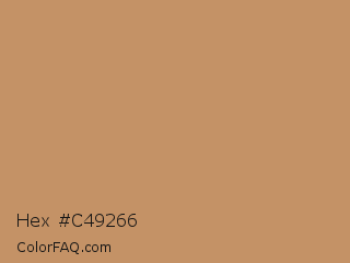 Hex #c49266 Color is a normal orange color and the nearest color is Antique Brass #c88a65. Hex code #c49266 and RGB value is rgb(196,146,102). In RGB color space, this color is composed of 77% red, 57% green, 40% blue, In CMYK color space, this color is composed of 0% cyan, 26% magenta, 48% yellow , 23% black , In HSL color space, this color has a hue angle of 28° , 44% saturation and 58% lightness.