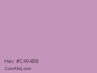 Hex #c494bb Color is a light magenta color and the nearest color is Pastel Violet #cb99c9. Hex code #c494bb and RGB value is rgb(196,148,187). In RGB color space, this color is composed of 77% red, 58% green, 73% blue, In CMYK color space, this color is composed of 0% cyan, 24% magenta, 5% yellow , 23% black , In HSL color space, this color has a hue angle of 311° , 29% saturation and 67% lightness.