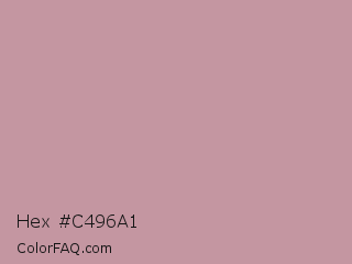 Hex #c496a1 Color is a light red color and the nearest color is Tuscany #c09999. Hex code #c496a1 and RGB value is rgb(196,150,161). In RGB color space, this color is composed of 77% red, 59% green, 63% blue, In CMYK color space, this color is composed of 0% cyan, 23% magenta, 18% yellow , 23% black , In HSL color space, this color has a hue angle of 346° , 28% saturation and 68% lightness.
