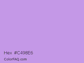 Hex #c498e6 Color is a light purple color and the nearest color is Bright Lavender #bf94e4. Hex code #c498e6 and RGB value is rgb(196,152,230). In RGB color space, this color is composed of 77% red, 60% green, 90% blue, In CMYK color space, this color is composed of 15% cyan, 34% magenta, 0% yellow , 10% black , In HSL color space, this color has a hue angle of 274° , 61% saturation and 75% lightness.