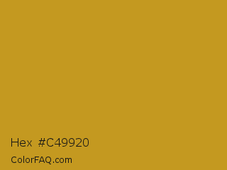 Hex #c49920 Color is a normal orange color and the nearest color is Nugget #c59922. Hex code #c49920 and RGB value is rgb(196,153,32). In RGB color space, this color is composed of 77% red, 60% green, 13% blue, In CMYK color space, this color is composed of 0% cyan, 22% magenta, 84% yellow , 23% black , In HSL color space, this color has a hue angle of 44° , 72% saturation and 45% lightness.