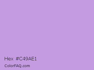 Hex #c49ae1 Color is a light purple color and the nearest color is Bright Lavender #bf94e4. Hex code #c49ae1 and RGB value is rgb(196,154,225). In RGB color space, this color is composed of 77% red, 60% green, 88% blue, In CMYK color space, this color is composed of 13% cyan, 32% magenta, 0% yellow , 12% black , In HSL color space, this color has a hue angle of 275° , 54% saturation and 74% lightness.