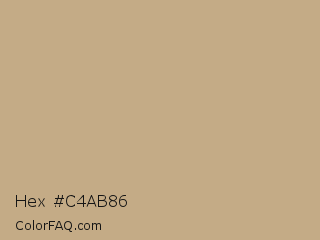 Hex #c4ab86 Color is a light orange color and the nearest color is Light French Beige #c8ad7f. Hex code #c4ab86 and RGB value is rgb(196,171,134). In RGB color space, this color is composed of 77% red, 67% green, 53% blue, In CMYK color space, this color is composed of 0% cyan, 13% magenta, 32% yellow , 23% black , In HSL color space, this color has a hue angle of 36° , 34% saturation and 65% lightness.