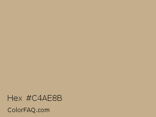 Hex #c4ae8b Color is a light orange color and the nearest color is Indian Khaki #c3b091. Hex code #c4ae8b and RGB value is rgb(196,174,139). In RGB color space, this color is composed of 77% red, 68% green, 55% blue, In CMYK color space, this color is composed of 0% cyan, 11% magenta, 29% yellow , 23% black , In HSL color space, this color has a hue angle of 37° , 33% saturation and 66% lightness.