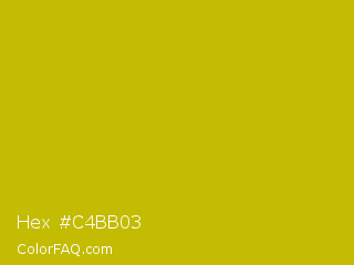Hex #c4bb03 Color is a normal yellow color and the nearest color is La Rioja #b3c110. Hex code #c4bb03 and RGB value is rgb(196,187,3). In RGB color space, this color is composed of 77% red, 73% green, 1% blue, In CMYK color space, this color is composed of 0% cyan, 5% magenta, 98% yellow , 23% black , In HSL color space, this color has a hue angle of 57° , 97% saturation and 39% lightness.
