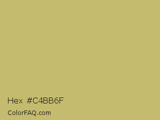 Hex #c4bb6f Color is a normal yellow color and the nearest color is Dark Khaki #bdb76b. Hex code #c4bb6f and RGB value is rgb(196,187,111). In RGB color space, this color is composed of 77% red, 73% green, 44% blue, In CMYK color space, this color is composed of 0% cyan, 5% magenta, 43% yellow , 23% black , In HSL color space, this color has a hue angle of 54° , 42% saturation and 60% lightness.