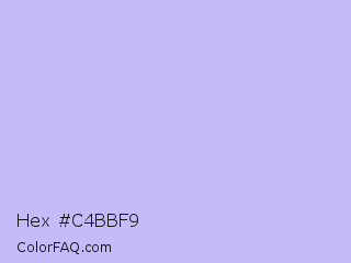 Hex #c4bbf9 Color is a very light indigo color and the nearest color is Melrose #c7c1ff. Hex code #c4bbf9 and RGB value is rgb(196,187,249). In RGB color space, this color is composed of 77% red, 73% green, 98% blue, In CMYK color space, this color is composed of 21% cyan, 25% magenta, 0% yellow , 2% black , In HSL color space, this color has a hue angle of 249° , 84% saturation and 85% lightness.