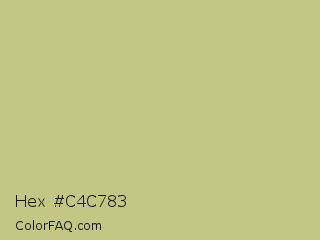 Hex #c4c783 Color is a light yellow color and the nearest color is Pine Glade #c7cd90. Hex code #c4c783 and RGB value is rgb(196,199,131). In RGB color space, this color is composed of 77% red, 78% green, 51% blue, In CMYK color space, this color is composed of 2% cyan, 0% magenta, 34% yellow , 22% black , In HSL color space, this color has a hue angle of 63° , 38% saturation and 65% lightness.
