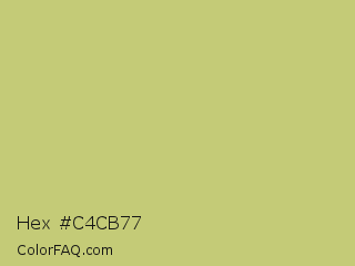 Hex #c4cb77 Color is a light yellow color and the nearest color is Wild Willow #b9c46a. Hex code #c4cb77 and RGB value is rgb(196,203,119). In RGB color space, this color is composed of 77% red, 80% green, 47% blue, In CMYK color space, this color is composed of 3% cyan, 0% magenta, 41% yellow , 20% black , In HSL color space, this color has a hue angle of 65° , 45% saturation and 63% lightness.