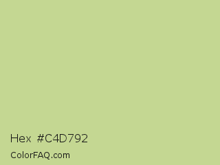 Hex #c4d792 Color is a light lime color and the nearest color is Pine Glade #c7cd90. Hex code #c4d792 and RGB value is rgb(196,215,146). In RGB color space, this color is composed of 77% red, 84% green, 57% blue, In CMYK color space, this color is composed of 9% cyan, 0% magenta, 32% yellow , 16% black , In HSL color space, this color has a hue angle of 77° , 46% saturation and 71% lightness.