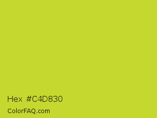 Hex #c4d830 Color is a normal yellow color and the nearest color is Pear #d1e231. Hex code #c4d830 and RGB value is rgb(196,216,48). In RGB color space, this color is composed of 77% red, 85% green, 19% blue, In CMYK color space, this color is composed of 9% cyan, 0% magenta, 78% yellow , 15% black , In HSL color space, this color has a hue angle of 67° , 68% saturation and 52% lightness.