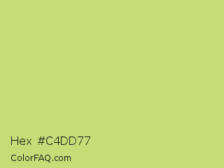 Hex #c4dd77 Color is a light lime color and the nearest color is Yellow Green #c5e17a. Hex code #c4dd77 and RGB value is rgb(196,221,119). In RGB color space, this color is composed of 77% red, 87% green, 47% blue, In CMYK color space, this color is composed of 11% cyan, 0% magenta, 46% yellow , 13% black , In HSL color space, this color has a hue angle of 75° , 60% saturation and 67% lightness.