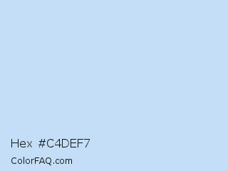 Hex #c4def7 Color is a very light blue color and the nearest color is Tropical Blue #c3ddf9. Hex code #c4def7 and RGB value is rgb(196,222,247). In RGB color space, this color is composed of 77% red, 87% green, 97% blue, In CMYK color space, this color is composed of 21% cyan, 10% magenta, 0% yellow , 3% black , In HSL color space, this color has a hue angle of 209° , 76% saturation and 87% lightness.