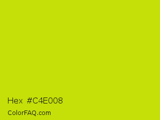 Hex #c4e008 Color is a normal yellow color and the nearest color is Bitter Lemon #cae00d. Hex code #c4e008 and RGB value is rgb(196,224,8). In RGB color space, this color is composed of 77% red, 88% green, 3% blue, In CMYK color space, this color is composed of 13% cyan, 0% magenta, 96% yellow , 12% black , In HSL color space, this color has a hue angle of 68° , 93% saturation and 45% lightness.