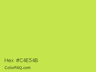 Hex #c4e54b Color is a normal lime color and the nearest color is June Bud #bdda57. Hex code #c4e54b and RGB value is rgb(196,229,75). In RGB color space, this color is composed of 77% red, 90% green, 29% blue, In CMYK color space, this color is composed of 14% cyan, 0% magenta, 67% yellow , 10% black , In HSL color space, this color has a hue angle of 73° , 75% saturation and 60% lightness.