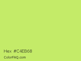 Hex #c4eb68 Color is a light lime color and the nearest color is Yellow Green #c5e17a. Hex code #c4eb68 and RGB value is rgb(196,235,104). In RGB color space, this color is composed of 77% red, 92% green, 41% blue, In CMYK color space, this color is composed of 17% cyan, 0% magenta, 56% yellow , 8% black , In HSL color space, this color has a hue angle of 78° , 77% saturation and 66% lightness.