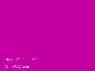 Hex #c500a1 Color is a normal magenta color and the nearest color is Red Violet #c71585. Hex code #c500a1 and RGB value is rgb(197,0,161). In RGB color space, this color is composed of 77% red, 0% green, 63% blue, In CMYK color space, this color is composed of 0% cyan, 100% magenta, 18% yellow , 23% black , In HSL color space, this color has a hue angle of 311° , 100% saturation and 39% lightness.