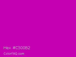 Hex #c500b2 Color is a normal magenta color and the nearest color is Deep Magenta #cc00cc. Hex code #c500b2 and RGB value is rgb(197,0,178). In RGB color space, this color is composed of 77% red, 0% green, 70% blue, In CMYK color space, this color is composed of 0% cyan, 100% magenta, 10% yellow , 23% black , In HSL color space, this color has a hue angle of 306° , 100% saturation and 39% lightness.