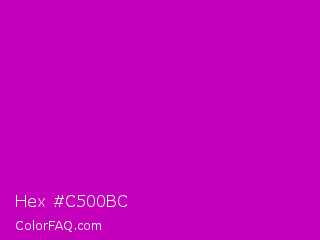 Hex #c500bc Color is a normal magenta color and the nearest color is Deep Magenta #cc00cc. Hex code #c500bc and RGB value is rgb(197,0,188). In RGB color space, this color is composed of 77% red, 0% green, 74% blue, In CMYK color space, this color is composed of 0% cyan, 100% magenta, 5% yellow , 23% black , In HSL color space, this color has a hue angle of 303° , 100% saturation and 39% lightness.