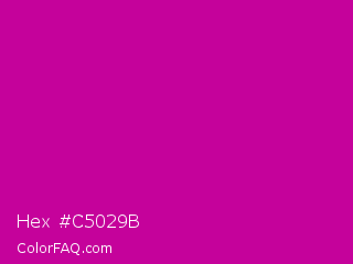 Hex #c5029b Color is a normal magenta color and the nearest color is Red Violet #c71585. Hex code #c5029b and RGB value is rgb(197,2,155). In RGB color space, this color is composed of 77% red, 1% green, 61% blue, In CMYK color space, this color is composed of 0% cyan, 99% magenta, 21% yellow , 23% black , In HSL color space, this color has a hue angle of 313° , 98% saturation and 39% lightness.