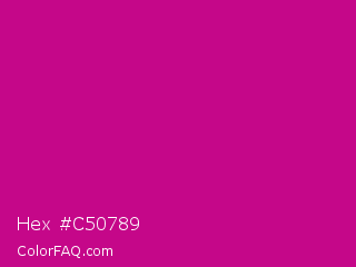 Hex #c50789 Color is a normal magenta color and the nearest color is Red Violet #c71585. Hex code #c50789 and RGB value is rgb(197,7,137). In RGB color space, this color is composed of 77% red, 3% green, 54% blue, In CMYK color space, this color is composed of 0% cyan, 96% magenta, 30% yellow , 23% black , In HSL color space, this color has a hue angle of 319° , 93% saturation and 40% lightness.