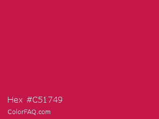 Hex #c51749 Color is a normal rose color and the nearest color is Maroon Flush #c32148. Hex code #c51749 and RGB value is rgb(197,23,73). In RGB color space, this color is composed of 77% red, 9% green, 29% blue, In CMYK color space, this color is composed of 0% cyan, 88% magenta, 63% yellow , 23% black , In HSL color space, this color has a hue angle of 343° , 79% saturation and 43% lightness.