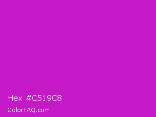 Hex #c519c8 Color is a normal magenta color and the nearest color is Deep Magenta #cc00cc. Hex code #c519c8 and RGB value is rgb(197,25,200). In RGB color space, this color is composed of 77% red, 10% green, 78% blue, In CMYK color space, this color is composed of 2% cyan, 88% magenta, 0% yellow , 22% black , In HSL color space, this color has a hue angle of 299° , 78% saturation and 44% lightness.