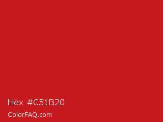 Hex #c51b20 Color is a normal red color and the nearest color is Fire Engine Red #ce2029. Hex code #c51b20 and RGB value is rgb(197,27,32). In RGB color space, this color is composed of 77% red, 11% green, 13% blue, In CMYK color space, this color is composed of 0% cyan, 86% magenta, 84% yellow , 23% black , In HSL color space, this color has a hue angle of 358° , 76% saturation and 44% lightness.