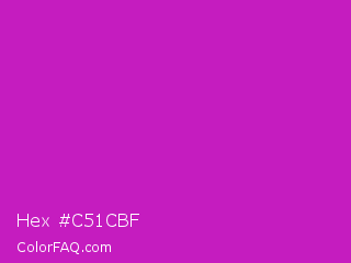 Hex #c51cbf Color is a normal magenta color and the nearest color is Steel Pink #cc33cc. Hex code #c51cbf and RGB value is rgb(197,28,191). In RGB color space, this color is composed of 77% red, 11% green, 75% blue, In CMYK color space, this color is composed of 0% cyan, 86% magenta, 3% yellow , 23% black , In HSL color space, this color has a hue angle of 302° , 75% saturation and 44% lightness.
