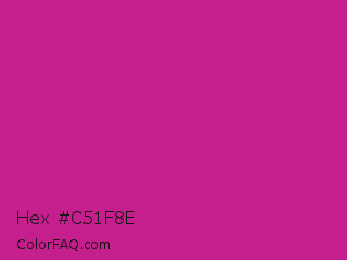 Hex #c51f8e Color is a normal magenta color and the nearest color is Red Violet #c71585. Hex code #c51f8e and RGB value is rgb(197,31,142). In RGB color space, this color is composed of 77% red, 12% green, 56% blue, In CMYK color space, this color is composed of 0% cyan, 84% magenta, 28% yellow , 23% black , In HSL color space, this color has a hue angle of 320° , 73% saturation and 45% lightness.