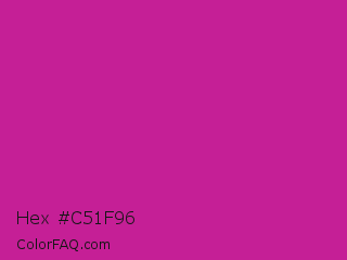 Hex #c51f96 Color is a normal magenta color and the nearest color is Royal Fuchsia #ca2c92. Hex code #c51f96 and RGB value is rgb(197,31,150). In RGB color space, this color is composed of 77% red, 12% green, 59% blue, In CMYK color space, this color is composed of 0% cyan, 84% magenta, 24% yellow , 23% black , In HSL color space, this color has a hue angle of 317° , 73% saturation and 45% lightness.