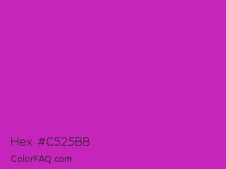 Hex #c525bb Color is a normal magenta color and the nearest color is Steel Pink #cc33cc. Hex code #c525bb and RGB value is rgb(197,37,187). In RGB color space, this color is composed of 77% red, 15% green, 73% blue, In CMYK color space, this color is composed of 0% cyan, 81% magenta, 5% yellow , 23% black , In HSL color space, this color has a hue angle of 304° , 68% saturation and 46% lightness.