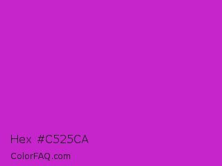 Hex #c525ca Color is a normal magenta color and the nearest color is Steel Pink #cc33cc. Hex code #c525ca and RGB value is rgb(197,37,202). In RGB color space, this color is composed of 77% red, 15% green, 79% blue, In CMYK color space, this color is composed of 2% cyan, 82% magenta, 0% yellow , 21% black , In HSL color space, this color has a hue angle of 298° , 69% saturation and 47% lightness.