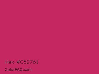 Hex #c52761 Color is a normal rose color and the nearest color is Rose Red #c21e56. Hex code #c52761 and RGB value is rgb(197,39,97). In RGB color space, this color is composed of 77% red, 15% green, 38% blue, In CMYK color space, this color is composed of 0% cyan, 80% magenta, 51% yellow , 23% black , In HSL color space, this color has a hue angle of 338° , 67% saturation and 46% lightness.