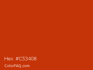 Hex #c53408 Color is a normal red color and the nearest color is Sinopia #cb410b. Hex code #c53408 and RGB value is rgb(197,52,8). In RGB color space, this color is composed of 77% red, 20% green, 3% blue, In CMYK color space, this color is composed of 0% cyan, 74% magenta, 96% yellow , 23% black , In HSL color space, this color has a hue angle of 14° , 92% saturation and 40% lightness.