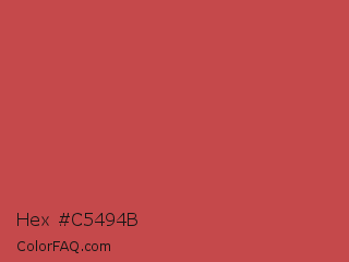 Hex #c5494b Color is a normal red color and the nearest color is English Vermillion #cc474b. Hex code #c5494b and RGB value is rgb(197,73,75). In RGB color space, this color is composed of 77% red, 29% green, 29% blue, In CMYK color space, this color is composed of 0% cyan, 63% magenta, 62% yellow , 23% black , In HSL color space, this color has a hue angle of 359° , 52% saturation and 53% lightness.