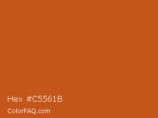 Hex #c5561b Color is a normal orange color and the nearest color is Orange Roughy #c45719. Hex code #c5561b and RGB value is rgb(197,86,27). In RGB color space, this color is composed of 77% red, 34% green, 11% blue, In CMYK color space, this color is composed of 0% cyan, 56% magenta, 86% yellow , 23% black , In HSL color space, this color has a hue angle of 21° , 76% saturation and 44% lightness.
