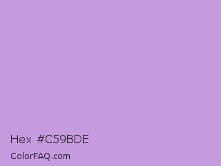 Hex #c59bde Color is a light purple color and the nearest color is Light Wisteria #c9a0dc. Hex code #c59bde and RGB value is rgb(197,155,222). In RGB color space, this color is composed of 77% red, 61% green, 87% blue, In CMYK color space, this color is composed of 11% cyan, 30% magenta, 0% yellow , 13% black , In HSL color space, this color has a hue angle of 278° , 50% saturation and 74% lightness.