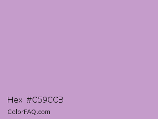 Hex #c59ccb Color is a light magenta color and the nearest color is Pastel Violet #cb99c9. Hex code #c59ccb and RGB value is rgb(197,156,203). In RGB color space, this color is composed of 77% red, 61% green, 80% blue, In CMYK color space, this color is composed of 3% cyan, 23% magenta, 0% yellow , 20% black , In HSL color space, this color has a hue angle of 292° , 31% saturation and 70% lightness.