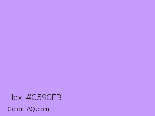 Hex #c59cfb Color is a light violet color and the nearest color is Pale Violet #cc99ff. Hex code #c59cfb and RGB value is rgb(197,156,251). In RGB color space, this color is composed of 77% red, 61% green, 98% blue, In CMYK color space, this color is composed of 22% cyan, 38% magenta, 0% yellow , 2% black , In HSL color space, this color has a hue angle of 266° , 92% saturation and 80% lightness.