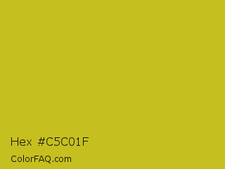 Hex #c5c01f Color is a normal yellow color and the nearest color is Key Lime Pie #bfc921. Hex code #c5c01f and RGB value is rgb(197,192,31). In RGB color space, this color is composed of 77% red, 75% green, 12% blue, In CMYK color space, this color is composed of 0% cyan, 3% magenta, 84% yellow , 23% black , In HSL color space, this color has a hue angle of 58° , 73% saturation and 45% lightness.