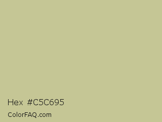 Hex #c5c695 Color is a light yellow color and the nearest color is Pine Glade #c7cd90. Hex code #c5c695 and RGB value is rgb(197,198,149). In RGB color space, this color is composed of 77% red, 78% green, 58% blue, In CMYK color space, this color is composed of 1% cyan, 0% magenta, 25% yellow , 22% black , In HSL color space, this color has a hue angle of 61° , 30% saturation and 68% lightness.