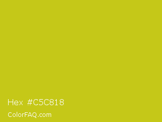 Hex #c5c818 Color is a normal yellow color and the nearest color is Key Lime Pie #bfc921. Hex code #c5c818 and RGB value is rgb(197,200,24). In RGB color space, this color is composed of 77% red, 78% green, 9% blue, In CMYK color space, this color is composed of 2% cyan, 0% magenta, 88% yellow , 22% black , In HSL color space, this color has a hue angle of 61° , 79% saturation and 44% lightness.