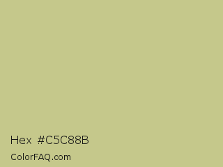 Hex #c5c88b Color is a light yellow color and the nearest color is Pine Glade #c7cd90. Hex code #c5c88b and RGB value is rgb(197,200,139). In RGB color space, this color is composed of 77% red, 78% green, 55% blue, In CMYK color space, this color is composed of 2% cyan, 0% magenta, 31% yellow , 22% black , In HSL color space, this color has a hue angle of 63° , 36% saturation and 66% lightness.