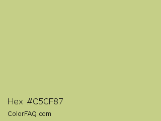 Hex #c5cf87 Color is a light yellow color and the nearest color is Pine Glade #c7cd90. Hex code #c5cf87 and RGB value is rgb(197,207,135). In RGB color space, this color is composed of 77% red, 81% green, 53% blue, In CMYK color space, this color is composed of 5% cyan, 0% magenta, 35% yellow , 19% black , In HSL color space, this color has a hue angle of 68° , 43% saturation and 67% lightness.