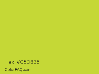Hex #c5d836 Color is a normal yellow color and the nearest color is Pear #d1e231. Hex code #c5d836 and RGB value is rgb(197,216,54). In RGB color space, this color is composed of 77% red, 85% green, 21% blue, In CMYK color space, this color is composed of 9% cyan, 0% magenta, 75% yellow , 15% black , In HSL color space, this color has a hue angle of 67° , 68% saturation and 53% lightness.