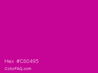 Hex #c60495 Color is a normal magenta color and the nearest color is Red Violet #c71585. Hex code #c60495 and RGB value is rgb(198,4,149). In RGB color space, this color is composed of 78% red, 2% green, 58% blue, In CMYK color space, this color is composed of 0% cyan, 98% magenta, 25% yellow , 22% black , In HSL color space, this color has a hue angle of 315° , 96% saturation and 40% lightness.